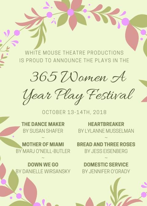 An evening of six ten-minute plays written as part of the 365 Women a Year project to promote gender parity in theatre and to tell the stories of women whom history may have forgotten. Includes plays by Susan Shafer’s The Dance Maker and 365 Women a Year’s organizer Jess Eisenberg’s Bread and Three Roses.