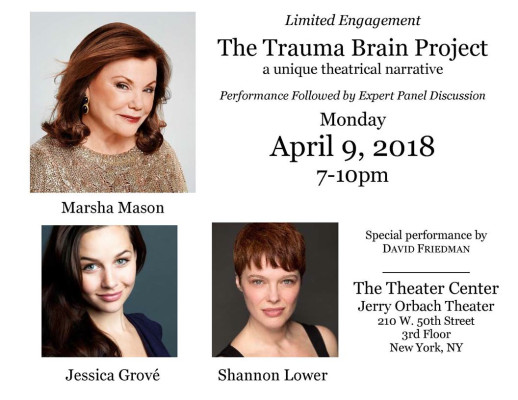 THE TRAUMA BRAIN PROJECT Written and Conceived by Dayle Ann Hunt Directed by Diaan Ainslee Produced by Pat Addiss (Executive) Katherine Elliot Shannon Lower NEW YORK, NY - Award-winning actress Marsha Mason joins the cast of The Trauma Brain Project for a one-night theatrical event on Monday, April 9th at 7pm, at The Jerry Orbach Theater in The Theatre Center (210 West 50th Street, 3rd Floor). Broadway actress Jessica GrovĂ© and Shannon Lower complete the cast. The Trauma Brain Project…