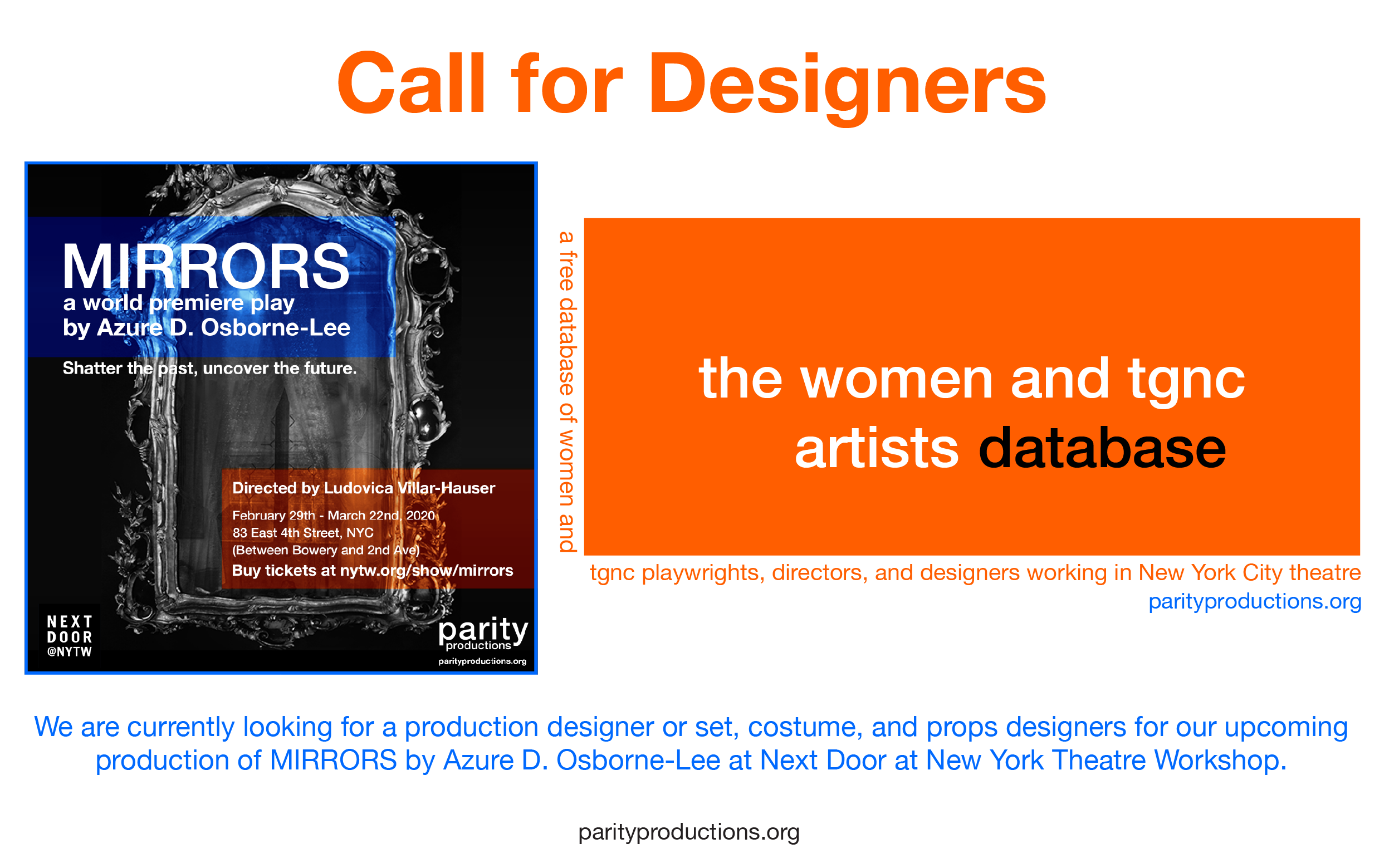 Not in the WTAD? No problem. If you are not listed in the database and qualify for a profile, click below to submit and email emily@parityproductions.org to let us know you’re interested in MIRRORS. https://www.parityproductions.org/get-listed-in-the-database.html