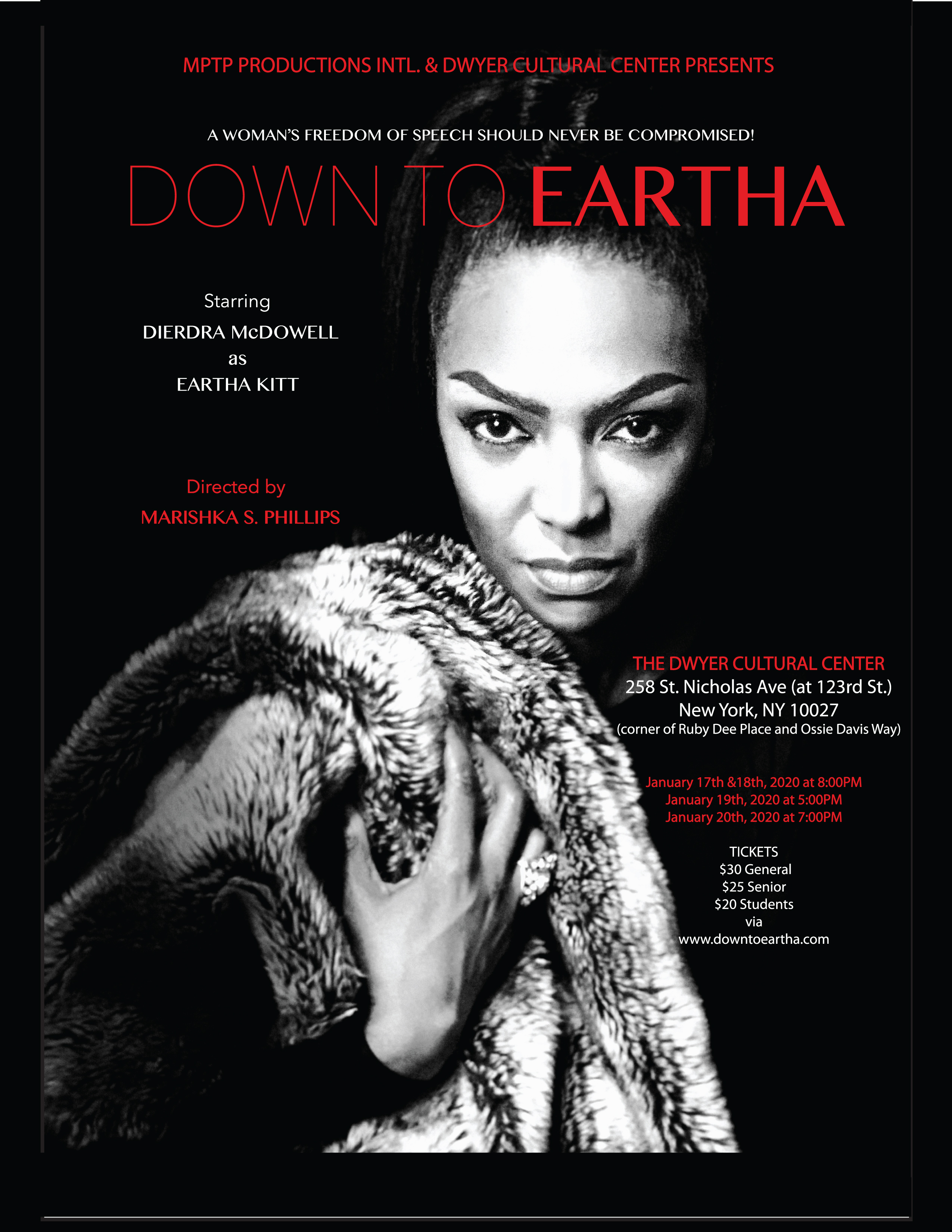 In 1968 while at the height of her career as a world renowned entertainer, Eartha Kitt was also working as one of the main lobbyist for a group of young activists called the Rebels With A Cause. During this time, Miss Kitt was then invited to the White House by Lady Bird Johnson to partake in a womens luncheon to discuss the issue of the rising crime rates in America. At the luncheon however, when Eartha stood up and expressed her views, stating that the increase in crime was mostly due to Americas involvement in the Vietnam War, Lady Bird Johnson was personally insulted by the comment and shortly after, by order of President Lyndon Johnson, Eartha Kitt was blacklisted from work in the United States for the following 10 years! DOWN TO EARTHA is a one woman show written and performed by Dierdra McDowell, and directed by Marishka S. Phillips. In one act filled with drama and music, this play explores Eartha Kitts personal re-encounter of that fateful day in detail. It also delves into her personal journey back to her power and freedom. Stemming from a life ridden with years of child abuse, Earthas personal journey proves to be at times a nightmare of a hurdle! It is one that could only be conquered by the power of love.