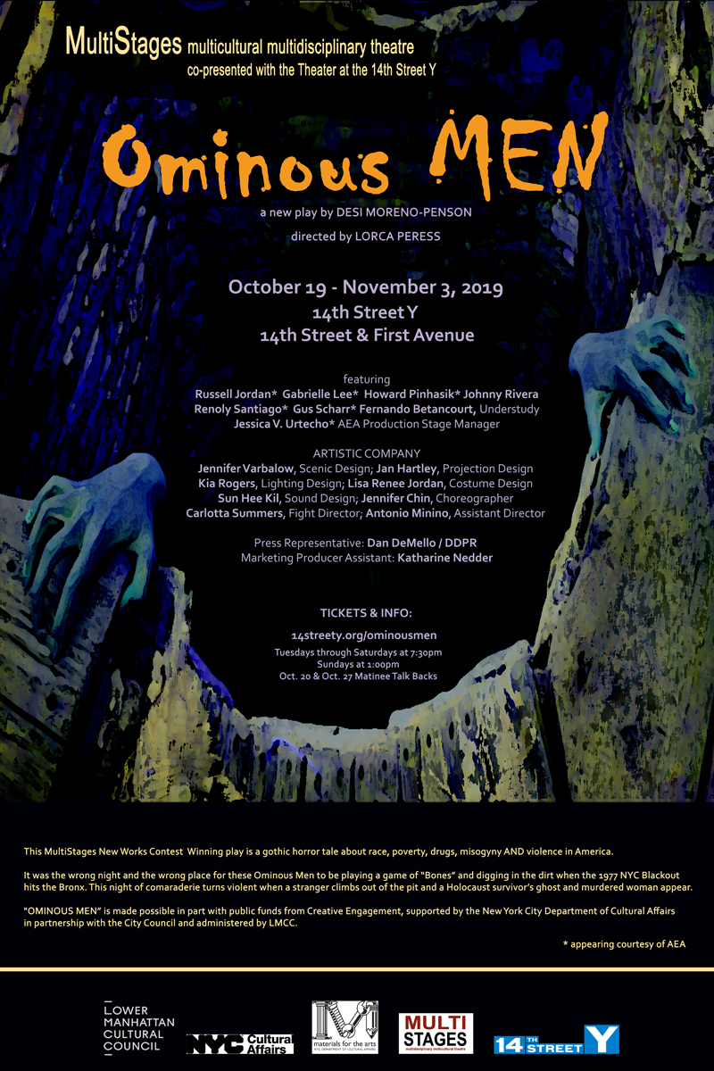 “Ominous Men” is MultiStages 2017 New Works Contest winning play by Desi Moreno-Penson, directed by MultiStages Artistic Director, Lorca Peress. “Ominous Men” is a gothic horror tale about race, poverty, drugs, misogyny AND violence in America. It was the wrong night and the wrong place for these OMINOUS MEN to be playing “Bones” when the 1977 NYC Blackout hits the Bronx! Three men are confronted by their ferocious pasts in the derelict Bronx Concourse Plaza Hotel basement on July 13, 1977: Butch, the Nuyorican caretaker who’s been digging a pit looking for buried treasure, his nervous cousin Goyo, and Butch’s drug sponsor and ex-Black Panther Yancy. This night of drinking, camaraderie and dominoes turns violent when the Blackout hits, a stranger climbs out of the pit, and the ghost of a Holocaust survivor and murdered woman appear.