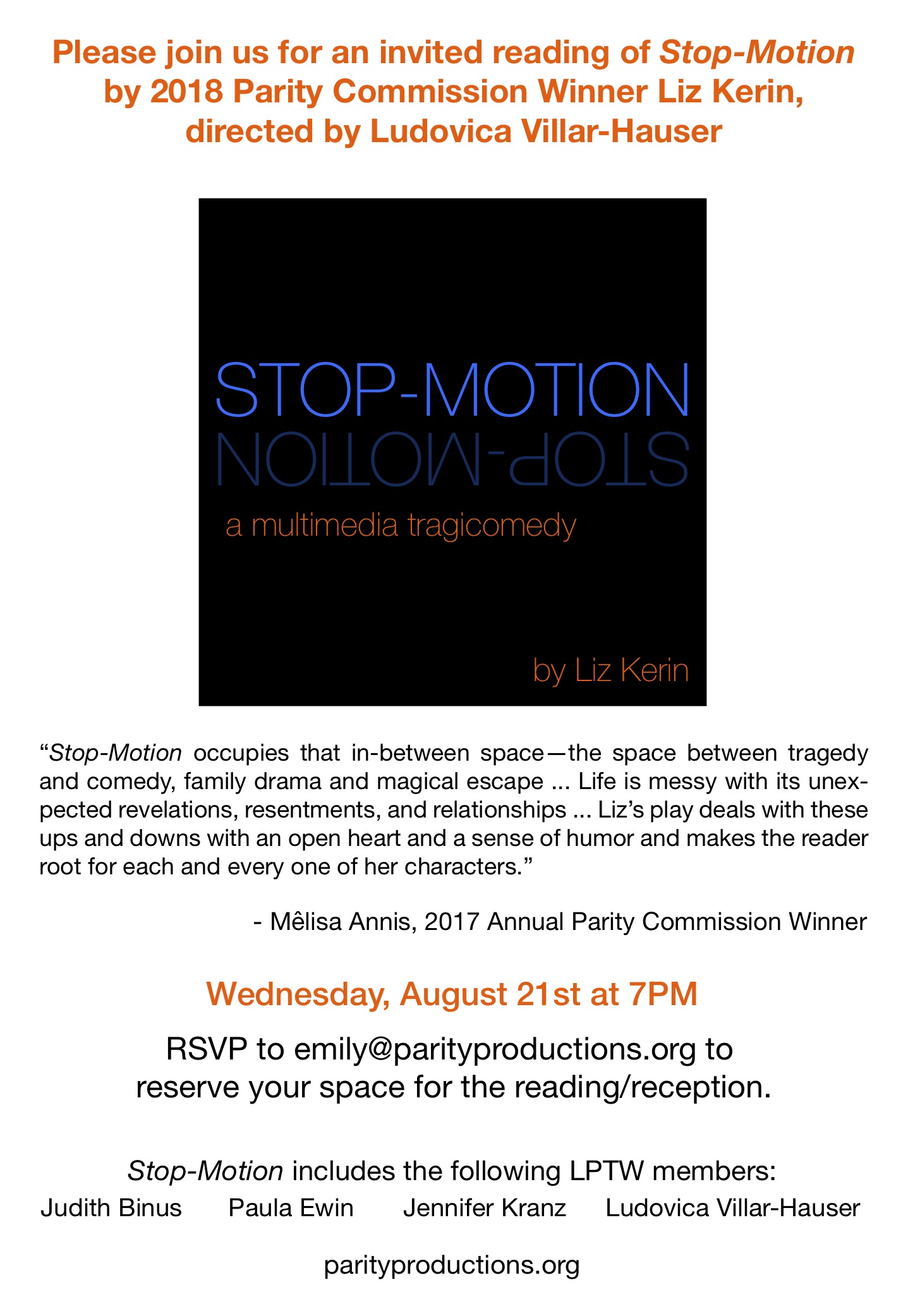 Please join us for an invited reading of “Stop-Motion” by 2018 Parity Commission Winner Liz Kerin, directed by Ludovica Villar-Hauser