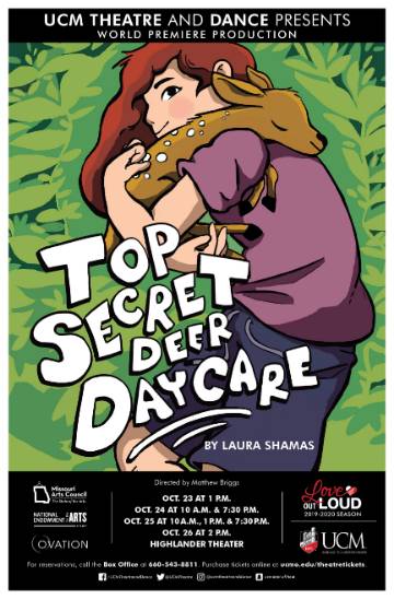 TOP SECRET DEER DAY CARE by Laura Shamas. Winner of the 2018-2019 National Playwriting Award for Theatre for Young Audience, awarded by the University of Central Missouri, Theatre and Dance, Warrensburg, MO. . Description: After moving with her parents from the city into a new house at the edge of the forest, Jill discovers a naturalist boy named Stanley sitting just beyond her backyard fence line. Captivated and intrigued by the sudden emergence of a young fawn and its family, Jill and Stanley join forces to protect the colonies of deer who have grazed the land for generations.